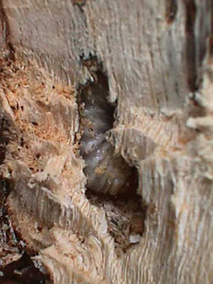 とりあえずクワ道さんの方へ行くことにしたが、着いてみると何と2ヶ所は隣同士の木であった。かなり濃いポイントらしい。そこでもカワラの立枯れがあり、上から削ってみると初令幼虫が数頭出てきた。これはクワ道氏やあ〜が見た限りでは飼育中のオオクワ幼虫に酷似しており、場所が場所だけにとても期待できる。すでに我々は勝手にオオクワと決めつけてしまった。一応全部クワ道氏に育てていただくことにした。うまく育ててオオクワにして欲しいものだ(おいおい)。