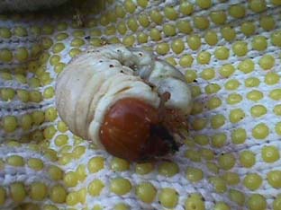 第一ポイントの北側を攻めてみたかったので、ブッシュをかきわけ突入していった。途中で一度休憩を入れたのだが、オオクワ幼虫の様子がおかしい。ピクリとも動かないのである。よ〜く見ると、外傷を1ヶ所発見できた。またやってしまったようだ。もったいない。