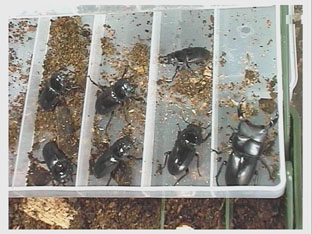 会社でクワガタを飼っているというチヌさんやクワ道の幼虫さんの話を聞いて、今日はいいチャンスなので幼虫を2頭持ってきてしまった。1頭はクワ道さんと韮崎近辺で採集した期待の2令幼虫、もう1頭は例のお祭り騒ぎで採集した3令幼虫である。成虫になるまで机の下で頑張ってもらおう。(エサ替えどないすんねん??)