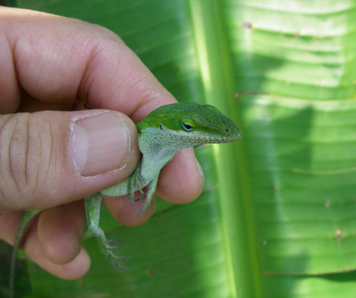 車から降りるとグリーンアノールがお迎え。特定外来種です。