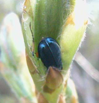 最初に向かったのはM方面です。が、こちらの山にはどうしたことかブナ林らしきものが見当たりませんでした。仕方なく○○まで戻り、以前行った事のある「××高原」に向かいました。途中山桜らしきものが咲いていた場所があったので、桜の写真も撮っておこうと思い車を降り写真を撮り始めた時、偶然すぐその横にある木の芽になにやらそれらしい甲虫が歩いているのを発見し、写真を撮ってみました。よくよく見るとその木には数箇所に同じ甲虫の姿が見えます。ただ、この色の甲虫は標高の高い山ではよく見かける(カミキリ虫等)ため、はたしてこれが件の「コルリクワガタ」なのか私にはわかりません。