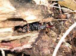 さらに奥に進んでみると思ったほど環境の良い場所ではなく、ショボい立ち枯れがたまにある程度の場所でした。試しに掴んで倒してみると簡単に倒れたのですが、その折れた部分になにやら見慣れない形の成虫が・・・。
