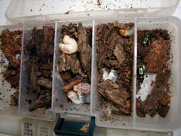 乾燥してフワフワになった表面部分を斧で切り取っては手で崩していきますが、なかなか成虫は出てきません。でも食痕はあるようでしたので根気良く続けていると、キラッと光るものが出てきました。