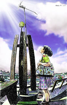 92.ラピュタ阿佐ヶ谷4〜屋上の風車〜更に螺旋階段を登っていくと屋上に出る。 そこには小型の風力発電機らしき風車がからからと春風に回っていた。 まるで帆船のマストのてっぺんに来たようだ。 ここからだと周りに高い建物がないので西側が遠くまで見渡せる。 温かい南風に吹かれていると 自分はこれからどんな未来に向かって進んで行くのだろうとふと想ってしまった。 そんな疑問から生まれたのが この「ラピュタ阿佐ヶ谷」なのかもしれない。