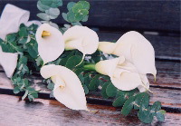カラーのクラッチブーケ 小さめのカラーに白小花とグリーンをバランス良く束ねて 挙式からカジュアルなパーティまで幅広く対応 ☆グリーン、小花は季節により変わります/高さ約25cm・7500円 |