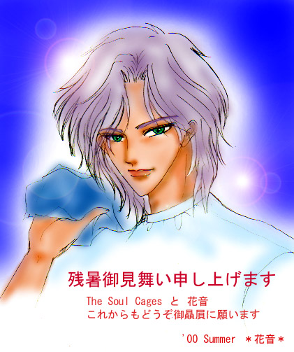 ご覧のとおり、花音さんからの残暑お見舞いです。私のリクエストで、「普通の兄ちゃんアリオス」。 爽やかですわん。このあいだのアリオス(自分の創作の)は、こんな感じかな〜と。 あの例の衣装は別にどうでもいいです。でもあれ女性がコスプレすると胸元が広くて色っぽいけどね(爆)。 何はともあれ、ありがとうございました!(はとみ)