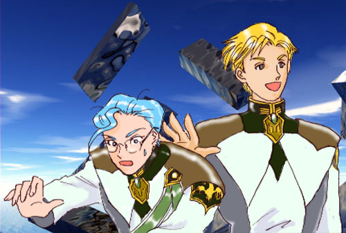 突発的、としか言いようのないエルンストとロキシー。よく見るとエルエルのデッサンがむちゃくちゃなので、よく見ないでね。(涙)。 CDドラマであまりにロキシーがおいしい役をやってるんで、なんかいいなあ、と思って描いてみたのです。この人はおっさんであってオヤジでないところがいい。心がなんか子供っぽいんだよね。(私はオヤジとショタは興味ないので…)研究員の服…っていうかエルエル自体描くの初めてなので、色使い等おかしなところは御勘弁!