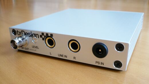背面 (音楽CDジャケット2枚重ね程度の大きさです) <主な特徴> FM放送帯で微弱電波を送信することができる屋内据置小型FMステレオ送信器です。 電波法の規定における許可・免許不要の電波出力に対応しています。 ミニFM放送、場内放送やガイド、各種小規模な催し、イベント等にもご使用いただけます。 別途アンテナが必要です。また、用途に合わせてミキサ、マイク、ケーブル等をご用意下さい。 価格は、本体、ACアダプタ付 38,000円(送料別)です。 <製品説明> ・電波法の規定により、実用受信可能範囲は障害物無しの環境において、ポケットラジオで半径20m、カーラジオで40m程度に制限されます。本器は電波出力の強度を幅広く変えることができますが、一般的な無指向アンテナ(ダイポール)使用の場合に電波法制限内となるように調整し出荷します。アンテナ種類や設置環境、ケーブル長、送信周波数等により実際の電波強度は変化します。使用環境に合わせて電波法制限内最大に出力を調整したい場合は、専門知識と測定器が必要です。 ・アンテナは市販のFM放送帯対応のものをご使用状況に合わせてご用意下さい。電波法の許す最大限の受信範囲を得るには、周囲に障害物が無くある程度(3〜5m)の地上高に無指向性のアンテナを設置することをお勧めします。当方では扱っておりませんので、アンテナメーカ、販売店等にお問い合わせ下さい。一例として屋外設置用アンテナは日本アンテナ製の受信用1素子FM専用アンテナ「AF-1-SP」を垂直に設置し、同軸ケーブルは5C-2V相当をお勧めします。 簡易的に送信器の周囲に電波を飛ばしたいだけであれば、本体に直接接続でき、伸縮可能なロッドアンテナをお勧めします。コメット製 「BNC-W100R」等が適合します。 ・送信機本体からの電波漏洩は非常に低レベルであり、周囲に与える影響や送信電波との干渉も極小です。接続するケーブルからの電波放射も抑えられています。 ・送信周波数は3つのロータリースイッチにより動作中でも直接設定できます。3つのスイッチの並び順に、○○.○MHzに設定します。 ・「LOCKED」LEDは設定した周波数で正常に出力されている時に緑色点灯、電源立ち上げ時、周波数設定変更や動作異常時には赤色点灯します。電源投入後、周波数がロックするまで1分程度かかります。この間LEDは赤色となり、電波出力は自動的に最低レベルに絞られます。 ・入力は市販の一般的な据置型音響機器出力レベル(ラインレベル)から業務用機器+4dBuにも対応。市販のほぼ全てのCDプレーヤ、ミキサ出力、PCのサウンドカード出力に対応します。また、本器はバランス入力ですが、一般民生機器のアンバランスにも対応します。 ・音声入力端子は、L/R別々にTRS(3極)標準フォーンジャック(6.3mm)となっています。2極のプラグでも入力できます。 ・一部のポータブル機器や一般的なマイクロフォンはレベルが低く、直接接続しても適正変調になりません。その際はミキサなどの機器を使用して下さい。また、約7Vp-p以上の入力はクリップします。 ・レベルモニタLEDが装備されています。通常は緑色に点灯しますが、標準変調レベルの約130%(±100kHzDeviation)を超えるピークレベルを検出すると約0.2秒赤色点灯します。赤色点灯は過変調(レベルオーバ)です。赤色点灯する場合は「DEVIATION」調整ボリュームを反時計方向に回し、変調レベルを下げてください。 ・「DEVIATION」LEDは電源電圧モニタも兼ねています。電圧が低下すると消灯します。 ・本器は入力にフィルタを設けており、CD等の音源を直接入力できますが、マルチバンドコンプレッサ等でFM放送の特性に適した処理を行った方が、より品質の高い放送を行えます。 ・電源スイッチは上に倒すとステレオ送信、下に倒すとモノラル送信、中央が電源OFFです。電波出力を継続したままステレオ・モノラルを切り替えることはできません。一旦電源がOFFになります。 ・モノラルはL+R信号のみの完全なモノラル送信です。L,R音声入力を合成し変調します。 ・本器に対応する各ケーブル等を別途ご用意し添付することもできます。ご相談ください。 <仕様> ・送信周波数 :76.0〜90.0MHz 0.1MHz間隔 ・発振方式 :PLLシンセサイザ方式 ・送信周波数安定度 :<±5ppm ・送信電力 :最大0.1mW(-10dBm)以上 最小0.01μW(-50dBm)以下(連続可変) ・送信電力安定度 :2dB以内 ・送信電力周波数偏差 :2dB以内 ・スプリアス :<-65dBm(高調波含む、0〜2.2GHz、全出力範囲) ・出力インピーダンス :公称50Ω ・出力リターンロス :15dB以上(VSWR<1.5) ・変調方式 :FMステレオ/モノラル ・アンテナ接続端子 :BNC-J ・音声入力端子 :TRS標準フォーンジャック(1/4")×2 ・音声入力 :バランス方式(アンバランス対応) ・入力インピーダンス :約6kΩ ・同相電圧除去比(CMRR) :50dB以上 @100Hz ・定格音声入力レベル :+4dBu(±10dB連続可変) ・音声周波数特性 :20Hz〜15kHz 偏差1dB以内 ・音声入力フィルタ減衰量 :>30dB@19kHz ・変調レベル偏差 :1dB以内(@送信周波数76〜90MHz) ・変調レベル安定度 :1dB以内 ・LRレベル差 :0.5dB以内 ・
