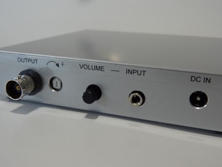 背面の外観 底面の外観 <主な特徴> 国内FM放送帯内(76〜89.9MHz)全チャンネルで微弱電波を送信することができるFMステレオ送信器です。 電波法の規定における許可・免許不要の微弱電波出力に対応しています。 ミニFM放送局開設、場内放送やガイド、各種催し、イベント等幅広くご使用いただけます。 別途、用途に合わせてミキサ、マイク、ケーブル等をご用意下さい。 価格は、ACアダプタ、ロッドアンテナ付 税・送料込 28,500円です。 <製品説明> ・電波法の規定により、実用受信可能範囲は周囲の環境や受信器の感度により変わりますが、障害物無しの見通し距離で、おおよそ半径10〜20m以内に制限されます。本器は電波出力の強度を幅広く変えることができますが、付属ロッドアンテナ使用の場合に電波法制限内となる出力で出荷しています。 ・微弱電波の発信には機器の登録や許可申請等は一切必要ありません。国内であればどなたでもご使用になれます。 ・屋内で送信器の周囲に電波を飛ばしたい場合は、付属のロッドアンテナを本体に直接接続し、垂直に曲げ最大に伸ばして(約0.6m)使用して下さい。短くする程、発射される電波が弱くなります。また、倒れやすいのでご注意下さい。 ・送信アンテナは、簡易的には付属のロッドアンテナを使用しますが、ご使用状況に合わせて市販のFM放送帯対応のものをご用意下さい。電波法の許す最大限の受信範囲を得るには、周囲に障害物が無くある程度(3〜5m)の地上高に無指向性のアンテナを設置することをお勧めします。 当方では扱っておりませんので、アンテナメーカ、販売店等にお問い合わせ下さい。一例として屋外設置用アンテナは、日本アンテナ製の受信用1素子FM専用ダイポールアンテナ「AF-1-SP」を垂直に設置し、同軸ケーブルは5C-2Vや5C-FB相当をお勧めします。 この場合インピーダンスは、ケーブルが75Ωで送信機が50Ωとなりますが、特に問題はありません。また、上記のアンテナは受信用ですが微弱電波の送信には使用可能です。 ・付属ACアダプタの他、下記仕様の電源やシガーソケットが利用できます。 電圧:DC10〜16V 供給電流:200mA以上 プラグ:内径2.1mm 外径:5.5mm 極性:センタープラス (12V電源車用シガーソケット電源ケーブルを別売1本300円で添付いたします。ご注文の際指定してください。) ・送信周波数は70.0〜89.9MHzの範囲で、動作中でもスイッチにより直接設定できます。 (76.0MHzより低い周波数は国内のFM放送用周波数ではありません。性能の保証は76.0〜89.9MHzの範囲です。) ・「ON AIR」LEDは設定した周波数で正常に出力されている時に緑色点灯、電源立ち上げ時、周波数設定変更や動作異常時には消灯します。電源投入後、周波数がロックするまで十秒前後かかります。 ・入力は市販の一般的な据置型音響機器出力レベル(ラインレベル-10dBV)から業務用機器+4dBuに対応。市販のほぼ全てのCDプレーヤ、ミキサ出力、PCのサウンドカード出力、iPod等のポータブルオーディオに対応します。入力音声信号の最大振幅は約0.3Vから5V(peak to peak)まで対応します。入力レベルに合わせて底面のゲイン切替スイッチを選択し、背面のボリュームで調整します。 ・一般的なマイクロフォンはレベルが低く、直接接続しても十分なレベルになりません。マイクを使う際はミキサなどの機器を使用して下さい。 ・変調度モニタLEDが装備されています。標準変調レベルに達すると緑色に点灯(約0.2秒ホールド)します。適切なレベル監視が可能です。エンファシス後のL,R両信号検出です。 ・音声入力端子はアンバランス入力です。ステレオ(3極)のミニフォーンジャック(3.5mm)となっています。端子の接続は一般的なものと同一で、先端からL,R,GNDです。 ・本器に適合する音声入力用ケーブル(1m)を添付しています。ステレオミニジャック(3.5mm)の音声出力コネクタに対応します。 ・本器はステレオ送信とモノラル送信を底面のスイッチで切替できます。ステレオ受信するとモノラルに比べノイズが増加するため、実質的に受信エリアが狭くなります。ステレオの必要が無い場合、モノラル送信に設定して下さい。 ・モノラル送信時は、LR両方の音声が合成されます。両方のチャンネルを入力していればレベルはステレオ時とほぼ同じになります。 ・内部にピークリミッタ回路があり、一定以上の音声入力のピークをクリップします。底面の「INPUT GAIN」スイッチが「H」の場合約1Vpp以上、「L」の場合約4Vpp以上でクリップします。また、内部プリエンファシス後に処理するため、高域が強い場合もクリップします。受信音声が歪まない程度にクリップさせると、受信音声レベルを大きくできます。変調度モニタはピークリミッタの後にレベル検出しています。 ・底面のスイッチで、プリエンファシスのON/OFFを選択できます。通常はONで使用しますが、外部のエンファシス対応のコンプレッサ等を使う時はOFFにできます。入力音声の高域を落としたい場合(10kHzで-10dB)もOFFにします。 ・本器は入力にフィルタ