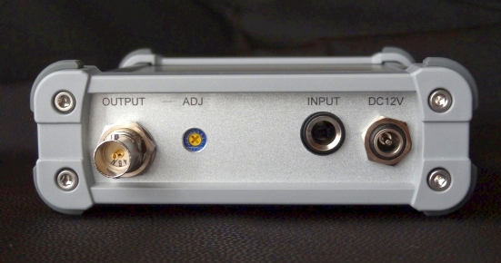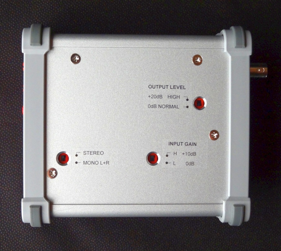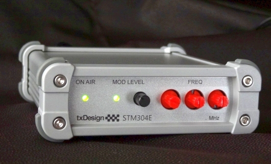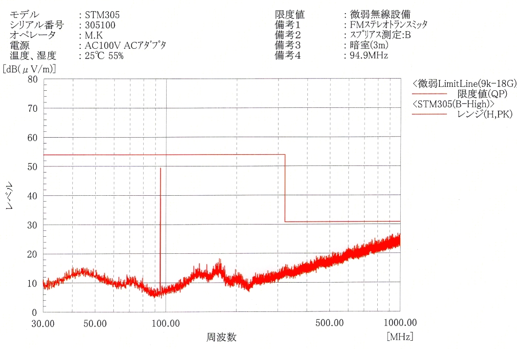 FMステレオトランスミッタ STM304E 2025.10.11 FMステレオ/モノラルトランスミッタSTM304Eの販売を開始しました。 ご注文はこのページ下部のリンクをご覧ください。 ![]() 背面 底面 <主な特徴> STM304Eは、国内FM放送帯76〜99MHz(ワイドFM対応)全チャンネルで微弱電波を送信することができる、FMステレオ/モノラル送信器です。(電波法の規定における免許不要の微弱電波機器) 市販のFMポケットラジオ、カーラジオ、FMチューナー等で受信でき、ミニFM放送局、場内放送や音声ガイド、各種催し、イベント等幅広くご使用いただけます。 用途に合わせてミキサ、マイク、ケーブル等をご用意下さい。 ロッドアンテナ、ACアダプタ付属 全国送料込 39,600円(税込)です。 <製品説明> ・電波法の規定により、実用受信可能範囲は周囲の環境や受信器の感度により変わりますが、障害物無しの見通し距離で、おおよそ半径10m〜程度に制限されます。 本器は電波出力の強度を幅広く変えることができますが、付属ロッドアンテナ使用の場合に電波法制限内となる出力で出荷しています。 ・微弱電波の発信には機器の登録や許可申請、技術適合証明(技適)等は一切必要ありません。国内であればどなたでもご使用になれます。 ・付属のロッドアンテナは、伸ばした状態で約50cm、折曲げ可能で本体に取付けて垂直にできます。 ・送信電波の強さは、本体背面のボリューム(小型マイナスドライバ使用)と底面のスイッチにより調整可能です。調整には測定器が必要です。市販のスペクトラムアナライザ(RF Explorer等)で電界強度を測定し、規制内に調整します。 ・送信周波数は70.0〜99.9MHzの範囲で、動作中でもスイッチにより直接設定できます。 FM補完放送(90〜99MHz ワイドFM)周波数帯の送信も可能です。 (76MHz以下及び、99MHz以上は国内のFM放送用周波数ではありません。) ・「ON AIR」LEDは設定した周波数で正常に出力されている時に緑色点灯、電源立ち上げ時、周波数設定変更や動作異常時には赤色点灯します。 ・入力は市販の一般的な据置型音響機器出力レベル(ラインレベル-10dBV〜+4dBu)に対応。市販のほぼ全てのCDプレーヤ、ミキサ出力、ポータブルオーディオ・PC等のヘッドホン、ライン出力等に対応します。 入力音声信号の最大振幅は約0.5Vから6V(peak to peak)まで対応します。入力レベルに合わせてボリュームとゲイン切替スイッチで調整します。 ・一般的なマイクロフォンはレベルが低く、直接接続しても十分なレベルになりません。マイクを使う際はミキサなどの機器を使用して下さい。 ・本器の入力コネクタは、一般的な6.3mmステレオフォーンジャック、アンバランスです。片側が6.3mmステレオプラグの、音声送出する機器と適合するシールドケーブルを別途ご用意ください。 ・変調度モニタLEDが装備され、容易に音声レベル監視が可能です。適切な音量レベルの時は緑色点灯、過剰な時は赤(橙)色に点灯します。 ・ステレオ送信とモノラル送信を底面のスイッチで切替できます。ステレオである必要が無い場合、モノラル変調の方が受信ノイズが減り、実質的に受信エリアが広くなります。 モノラル送信時は、LR両方の音声が合成されます。両方のチャンネルを入力していればレベルはステレオ時とほぼ同じになります。 ・電源スイッチはありません。ACアダプタをコンセントに挿抜することで電源を入切してください。 ・市販のモバイルバッテリ等のUSB出力(5V)を、本器に対応する12Vに変換するアダプタを税込2,800円で別売しております。 STM303/304 1台のみ供給可能。USB出力1A以上のUSB出力ACアダプタ、モバイルバッテリ、USB-A端子付PC等からの給電に対応します。USB側の機種によっては使用できない場合が稀にあります。容量10,000mAh(3.7V)のバッテリーで15時間程度動作します。 ・車(12V専用)のシガーソケットから給電できるケーブル(約1m)を税込1,000円で別売しています。通電するとシガープラグのLEDが赤色点灯します。(内臓ヒューズ1A) ・使用部品の変更等に伴い、外観が本ページ掲載の写真と少し異なる場合がございます。 ・本製品には印刷の取扱説明書は付属しません。下記のpdfファイルをご覧の上、正しくご使用下さい。 STM304E 取扱説明書(pdf) 対象の製造番号:304500〜304599 <参考資料> 認証検査機関による同等製品の微弱電波機器試験成績(抜粋) (暗室試験にて電波法規定内となっています) <主な仕様> ・発振方式 :PLLシンセサイザ ・送信周波数 :70.0〜99.9MHz 0.1MHz間隔 ・周波数安定度 :±3ppm以内 ・送信電力:最大1mW(0dBm)以上 最小0.2μW(-37dBm)以下 ・スプリアス :-65dBm以下@〜1GHz出力端子 ・変調方式 :FMステレオ/モノラル ・電波出力端子 :BNC-J ・送信出力インピーダンス :公称50Ω/75Ω ・音声入力 :3極フォーンジャック(φ6.3) アンバランス方式 ステレオ ・入力インピーダンス :約3kΩ ・適合音声入力レベル範囲 :0.5〜6Vpeak to peak ・エンファシス :50μs ・音声周波数特性 :10Hz〜17kHz@3dB ・ひずみ率 :0.1%以下@1kHz (THD 100%変調時) ・LRレベル差 :0.5dB以内 ・変調度偏差 :1dB以内@75〜95MHz ・LRチ