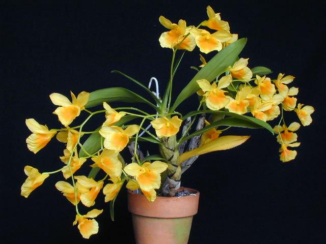 Den. capillipes var. elegance ’Suwada’ デンドロビウム カピリペス エレガンス ’スワダ’ ’01/4/2 撮影 インド、中国南部から タイ、 ベトナム にかけて広く分布。 花径 4 cm。 var. elegance は、capillipes とは別種で、Den. sukhakulii と書いてある本もある。 花着きよく、花も大きくて見栄 えする株です。