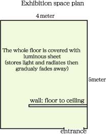 The vieweres are asked to change their shoes to this special sandals which have LED and Lithium batteries built in. Wearing this sandals, walking on the luminous floor, vieweres leave their foot steps clearly wherever they walk. |