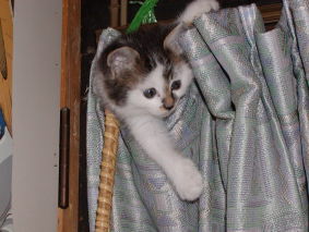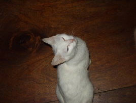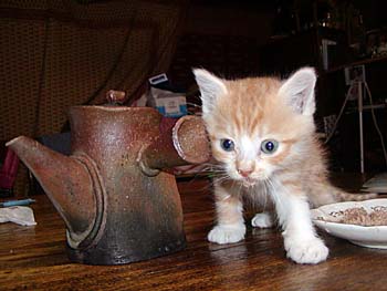 近所の女の子が拾って廃校になった小学校の飼育小屋で大切に育てていた。が見かねてつれた来た。一緒にいた黒猫は晴れてあずきさんちに引き取られ銀平と名づけられて可愛がられている。