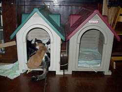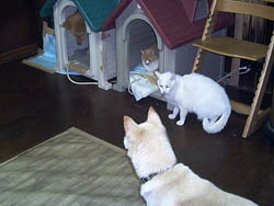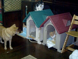 時々犬たちを猫たちの部屋に入れてみる。別の部屋だとがうがうしたりするくせにじゃ、入ってみなと入れてみると犬たちはおっかなびっくりで猫たちのご機嫌をうかがってすきあらば猫ご飯を食べちゃう。もしくは猫トイレからンコなどくわえて来たりもする!あら、この犬小屋懐かしいわ、入っちゃおうかしら、ちょっとならいいわよね、入っちゃお・・・勇気あるチャッピーの行動でした。ゆりは入りたいけど猫たちが怖くて入れません。