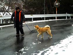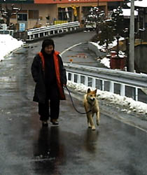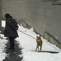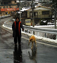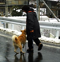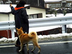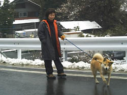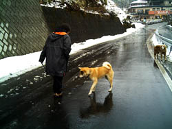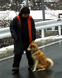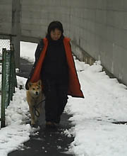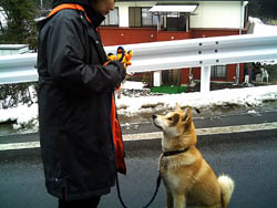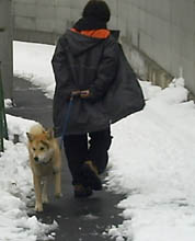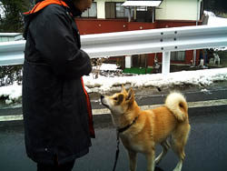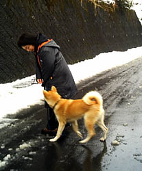 訓練受ける前と比べると雲泥の差とは言え今まで7ヶ月間好き勝手にさせてしまっていたのです、めぐは声をかけたり合図をすれば、戻ってきてそばに来るようになりました。が、すぐまた引っ張るのです。そこでこの方法は本来ならもっと小さい頃にやって、引き綱を引いても思い通りにならないということを学習させるために効果的な方法だそうです。後ろでに引き綱を持ち、引っ張ったら逆向きに歩き出してしまうのです、犬は怒られもせず誉められもせず引かれたら無条件で逆に歩き出すのを繰り返すと引いてる人のそばにつくようになります。今私は毎朝夕、10分間くらいめぐをこの方法で歩かせています。