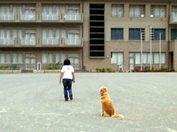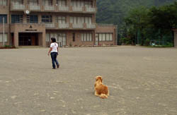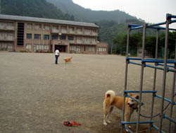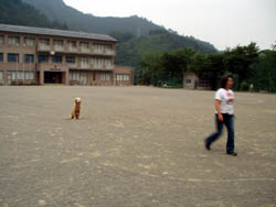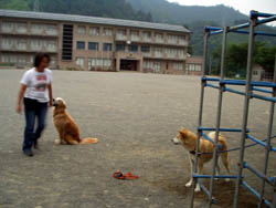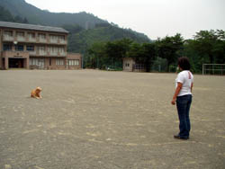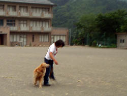 校庭は誰もいませんでした。広い場所が使えるのでこの日初めて先生が地面に線を書いてそこを目印にいろいろなお勉強をしました。何するんだろう?こっちがドキドキ!まずちゃんと左側を歩かせて線のところでスワレマテ、いいよで立たせてまた歩かせてまた線まで来たら繰り返し。先生にやっていただくとめぐの嬉し度が違います〜。びっくりするのはメグミは新しいことを覚えるのが本当に早いです。やっぱり脳が若いのでしょうか。