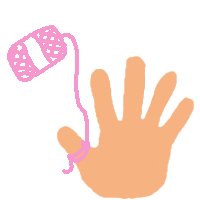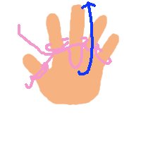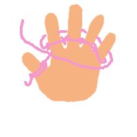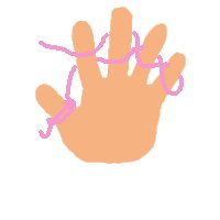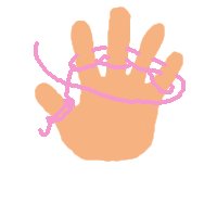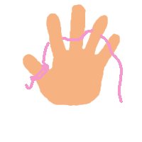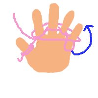 | 毛糸の先を親指に2回くらい巻きつけます。引っ張っても解けないように止める為。 | 人差し指の後ろから交互にゆびに掛けていきます。 | 小指から逆に掛けていきます。 | |