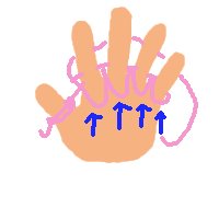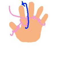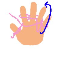 | 人差し指まで戻ってきたら4本のゆびに1回転掛けます。 | 始めに掛けた糸を少し引っ張って後から掛けた糸を覆うように小指に掛けます。 | 薬指も同じく少し引き出して指に掛けます。 | |
