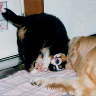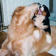 ![]() | あんずに耳元を押さえられて 頭を下げたら こんな格好になってしまった この後は、肩からそのまま ごろりと身を投げ出して あんずに服従する 今でもあんずと遊んでいるときは まったく同じ格好で降参する |