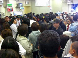| さて、添乗員さんが切符の手配に行っている間、ちょっとだけ添乗員さんのお手伝い。 「は〜い、側にいて下さいね。お土産は今買わないでくださ〜い。ほら、そこのおじさん、話をちゃんと聞いてください!」 |