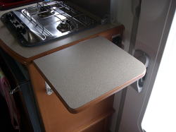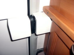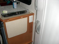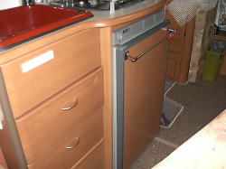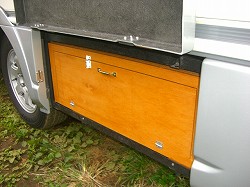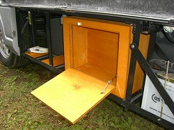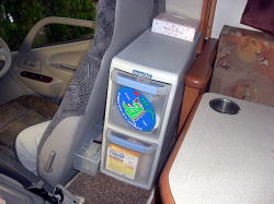 6 収納ボックス設置 運転席とダイネットの間のスペースに収納ボックスを設置しました。ちょっとした小物を入れています。ただ、置いてあるだけなので、カーブの時など、引き出しが開いてしまいますが(笑) |