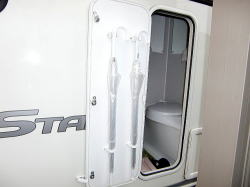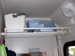 3 トイレルーム突っ張り棚 定番てことで。お風呂道具を中心に載せています。一度走行中に棚ごと落下してしまいました。そのうち落下防止対策をしようと思いますが。 |