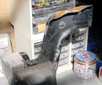 これが壊れたフロント・バンパ。ステー、リーフォースメントが曲がり、右コーナーが脱落している。