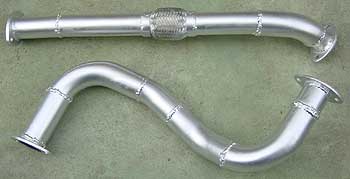 現物合わせで溶接する。因みに、こちらがフロントパイプ。できるだけタービンに近い位置にフレキシブル・パイプを付けてみた。