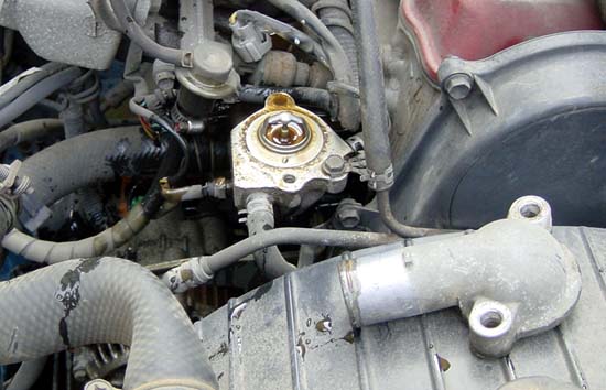 | サーモスタット交換 最近、ジムニーの水温が上がらない現象が発生している。ヒーターの温度を目一杯にしても、温風はちょっとぬる目で、いかにも”水温が上がってませんっ”て感じ。エンジンは普通に動いているし、ラジエータ周はいつも通りなので、どうやらサーモスタットが怪しい…。 と言う事で、大した話では無いが、今回はサーモスタット交換のお話し。 さて、ジムニーのサーモスタット交換は非常に簡単である。エンジンの冷却水のアウトレットのアクセスし易い所にサーモスタットがある。 ![]() サーモスタットの交換には、先ずは冷却水を抜く。ま、別に入れたままでも交換できなくは無いが、ついでだから交換しておいた方が良いだろう。抜いた冷却水はサビと言うか水アカというか、かなり濁り水状態となっていた。 ![]() アウトレット(サーモスタットのカバー)を外すと、サーモスタットにアクセスできる。サーモスタットは単にははめ込んであるだけなので手で簡単に外れる。(普通は。固着していなければ…) ![]() 左が不良になったモノ。バルブが開きっぱなしである…。かなり落としたが、水アカ(?)だいぶ付いていて動きが渋い。右が新品。形がかなり変わっている。 ご存じの通りサーモスタットは水温でワックスが膨張しバルブが開閉するだけなので、壊れる所も無さそう…。水アカをよ〜く掃除し、鍋に水を入れてガスコンロにかけると、サーモスタットの開く様子が観察できる。当初、動作的に問題さなそうだったので、セコく古いモノを再利用したが、2〜3日で同じ現象が発生した。(どこが壊れるんだろ…?) と言う事で、実は、写真は二回目の交換の際の写真だ。(^_^;) ![]() 交換の際にはガスケットも交換しよう。セコく再利用しようなどと考えてはいけない。水漏れすると大惨事になるから… ![]() [TOP] |