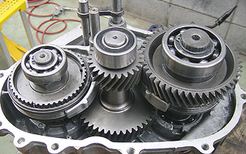 ベアリングを移植し、逆の手順でギアをセットする。カウンタギアが大きくなったので普通に組むとベアリングに干渉し取り付けられない。3つのギアを同時に少しづつ組み付けて行く。