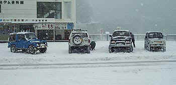 今月の走行会は某林道での雪中走行。気合い十分、前日から泊まり込んで集合場所でみんなを待つが、時間になっても誰一人として来ない。深夜から降り始めた雪はますます強くなるし、携帯も電波が入らないし、ど〜なってんのかなぁ…。林道の入り口まで行ってみるが、誰もいない…。仕方なく携帯の電波が届くところまで戻り、なんとかしまさんと電話が繋がった。 …どうやら、違うところで待っているらしい。いかんなぁ…! 良く聞くと、みんなそこに集合しているらしい…。 す、すんません、間違えましたぁ! 速攻で集合場所へダッシュ!!