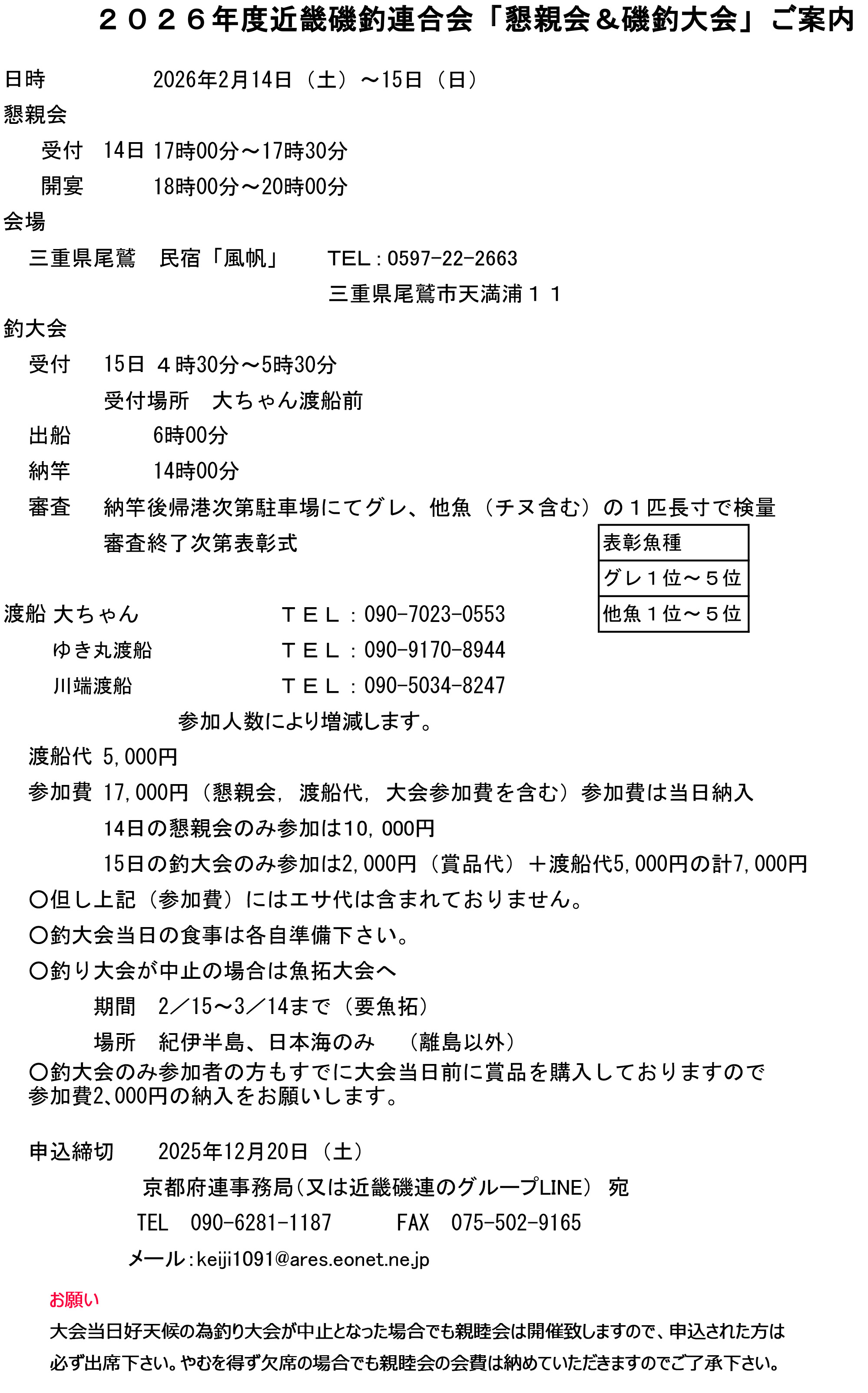 2026年2月15日和歌山荒磯釣倶楽部寒グレ大会と近畿磯釣連合会の親睦釣り大会を同時開催致します。