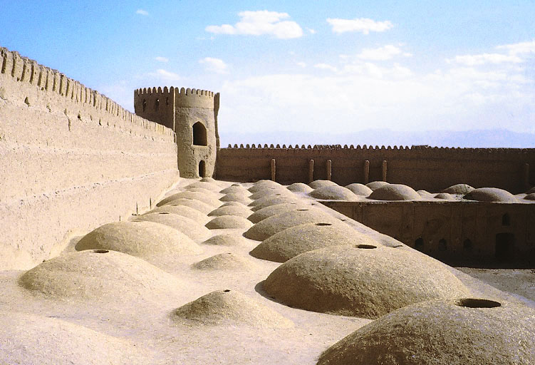 A view of the roof of a stable surrounding a courtyard, Bam. A hole on top of each earthen dome is a skylight window.