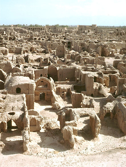 A view of an urban district from the citadel, Bam. Buildings built of earth were gradually going back to the ground, with walls and roofs collapsing.