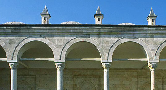 A それはトルコ型。15世紀以降に あらわれる モスクの第3の典型です。この国は イスラーム圏の中では もっとも寒い地域で、雨も多い。アナトリア高原には 冬になると雪も降ります。だから 寒さと雨をよけるために、中庭にドームをかけた。あるいは 中庭はそのままで、礼拝室の奥行きを深くして ドーム屋根をかけ、そちらを メイン・スペースにした。