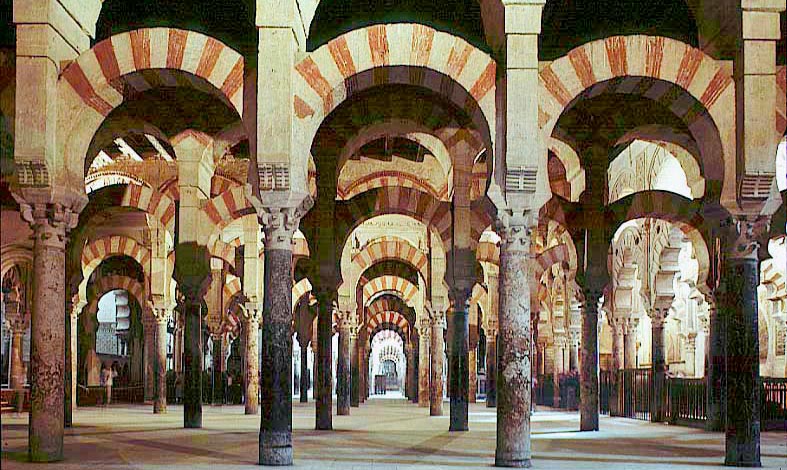 スペイン、コルドバのモスク(メスキータ)8-10世紀 だんだら模様の2段重ねのアーチが織り成す広大な礼拝室は、 実に幻想的な空間をもたらした。 柱の短さを逆手にとって、他に例を見ない こうした設計をしたのは、天才的な建築家だったにちがいない。