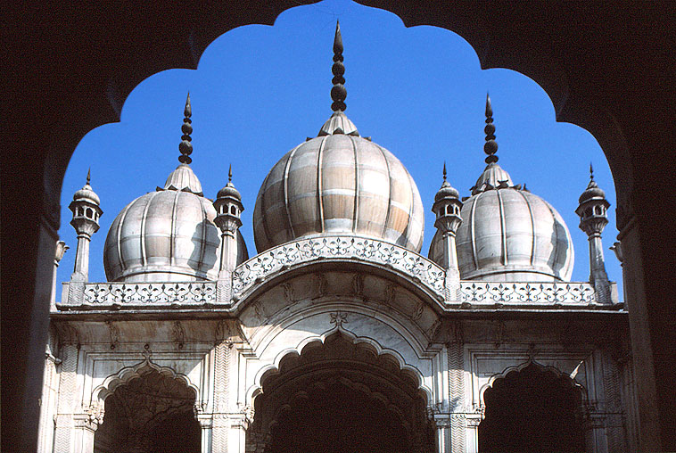 インド型モスク モティ・マスジド(真珠モスク)1662年、デリー城内(インド) シャー・ジャハーン帝による、白大理石の宮廷礼拝堂。 小モスクだが、球根形 3連ドームが象徴するように、過剰なほど装飾的である。
