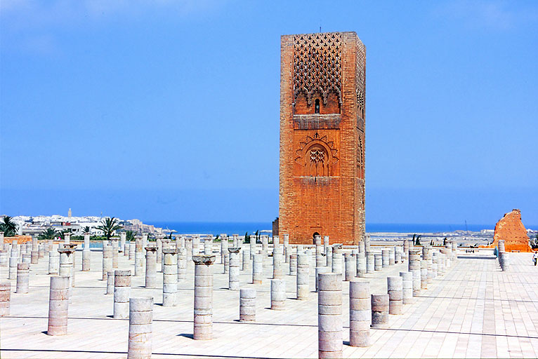 アラブ型モスク ハッサン・ モスク 、12世紀末、ラバト(モロッコ) 1195年に 世界最大のモスクを目指して着工されたが、未完成に終わった。 ハッサンの塔と呼ばれる ミナレットと、列柱ホールの 200本の柱の基部のみが残る。