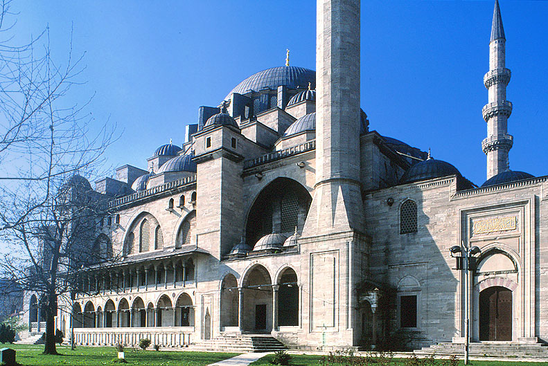 トルコ型モスク スレイマニエ(スレイマン 1世のモスク)の外観、1550-7年、イスタンブル(トルコ) ドーム屋根の頂部まで、モスク全体が 山のように盛り上がる。 山を下から見上げると、実際の高さほどの威容は感じさせない。