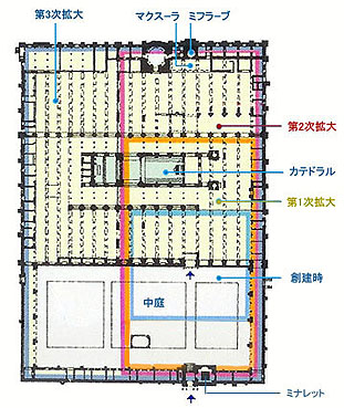 9世紀半ばには 礼拝室が奥行き方向に拡張されて 138m に伸び、さらに 10世紀初めには 186m にまで引き伸ばされた。10世紀末には側面にも増築されて、最終的に 136m×138m の規模となり、内部の柱は 600本を数えた。
