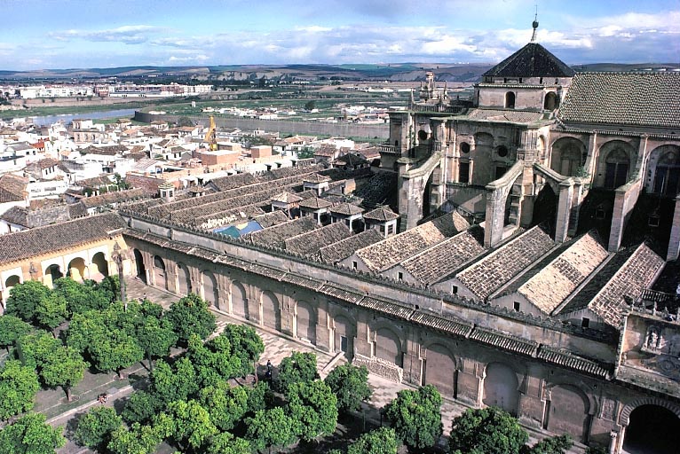 The foreground is the Patio de los Naranjos (courtyard of orange trees).
