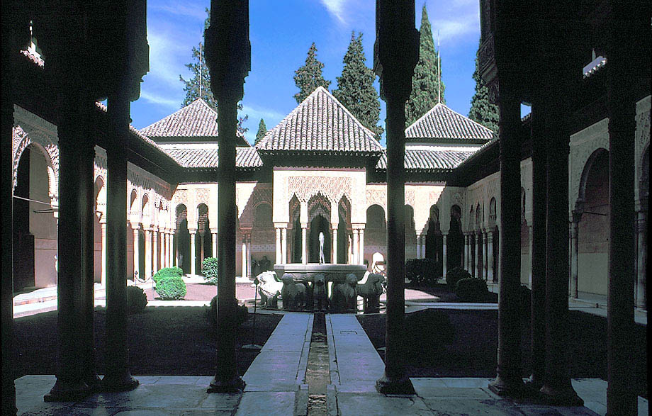 The Patio de los Leones (the Court of the Lions) in the Alhambra Palace. It forms a Chahar Bagh or quartered garden with four channels and the Lion Fountain in the center.