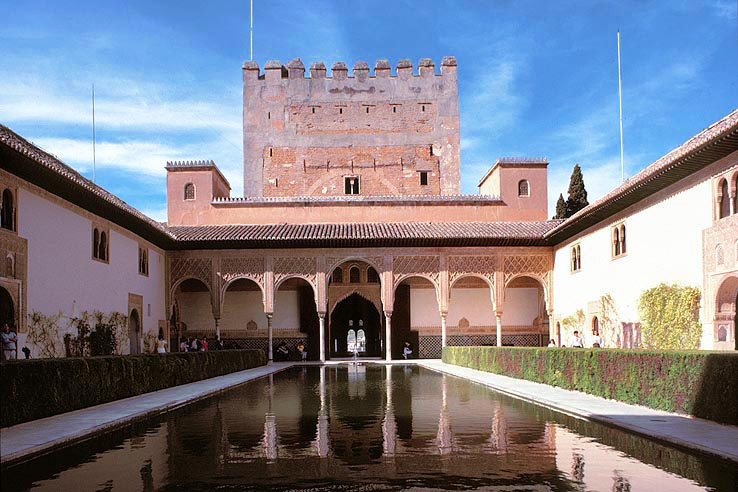 The Patio de los Arrayanes (the Court of the Myrtles) in the Alhahmbra Palace. The tower of Comares and its arcade are reflected on the water surface.