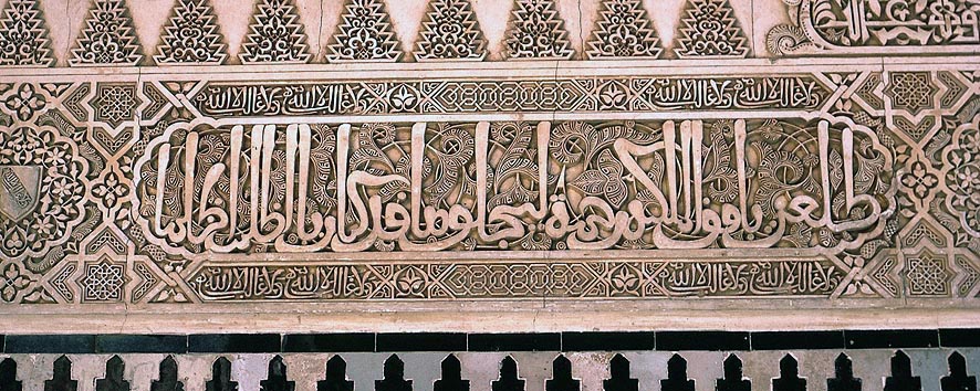 Calligraphy carved on a stucco wall shows a stanza of the "Koran", the Court of the Myrtles.