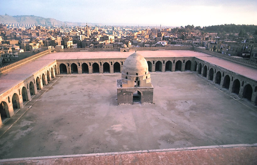 アラブ型モスク イブン・トゥールーン・モスクの中庭、9世紀、カイロ(エジプト) 奥がメインの礼拝室。回廊(脇礼拝室)ともども、中庭と 連続していて、何の隔てもなく、自由に行き来できる。 中庭の中央にあるのは、浄めの泉亭。