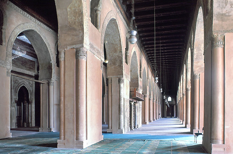 レンガ造のアーケードがキブラ壁と平行に並ぶ、列柱ホール型の礼拝室。 左手奥にミフラーブ、右手少し先に木製の「ディッカ」が見える。 ディッカ(応唱台)というのは、金曜礼拝時に イマームの姿勢をまね、言葉を繰り返して、 後方の会衆に伝える役割の人が立つ台である。 この台の柱は石柱。
