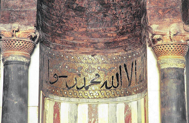 イブン・トゥールーン・モスクの、修復されたミフラーブまわり詳細。 ビザンティンの竹かご風柱頭と金地のモザイク装飾、下部は色大理石によるストライプ。 意外なのは 上部の半ドームとアーチが木で仕上げられていること。 他の例が思い浮かばない。