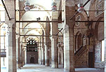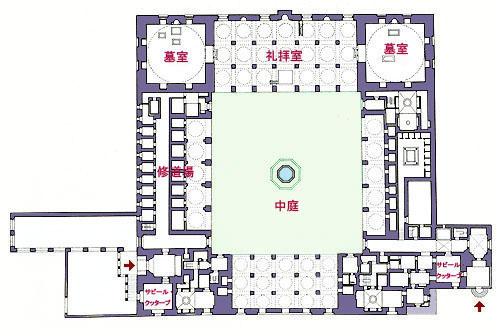 といっても 全体計画はシンプルな枠組みに納められていて、約 40m角の中庭のマッカ側が 列柱ホールの礼拝室となっているから、一見、通常のモスクのようにも見える。しかし 実際は 礼拝室の両側に 直径 14mを超える大ドーム屋根の墓室があり、その横手には3層のデルヴィーシュ(スーフィーの 修行僧)たちの寮室が並んでいる。