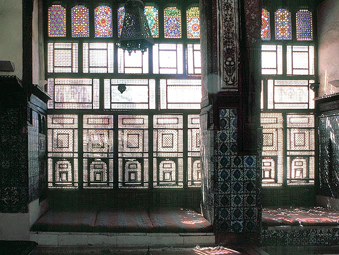 2階のカーアの、大窓の木製マシュラビーヤ。