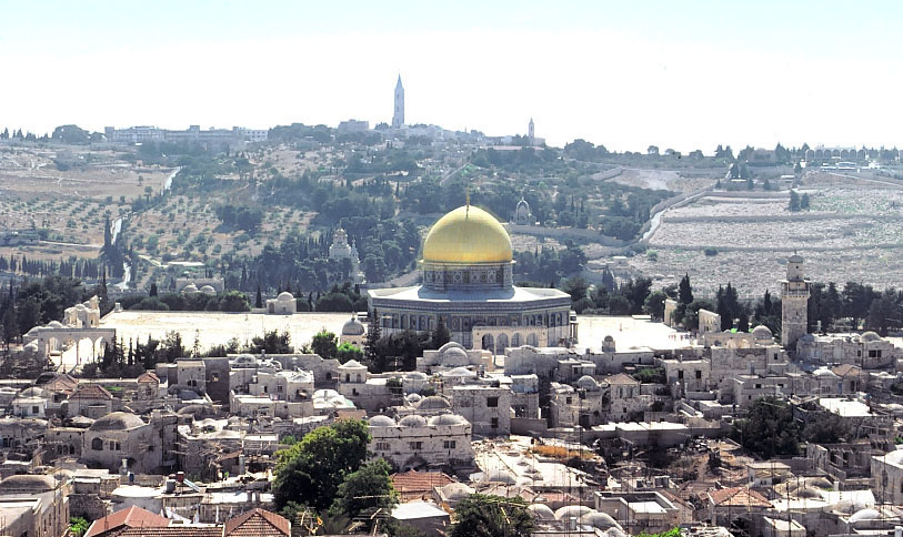 The Dome of the Rock standing in the Haram al-Sharif (sanctuary) on Mount Moriah. The background is the Mount of Olives.